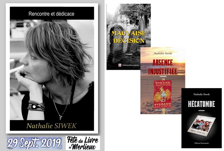 Nathalie SIWEK dédicace HÉCATOMBE et ABSENCE INJUSTIFIÉE lors du salon du livre de Merlieux (02), le dimanche 30 septembre 2018.